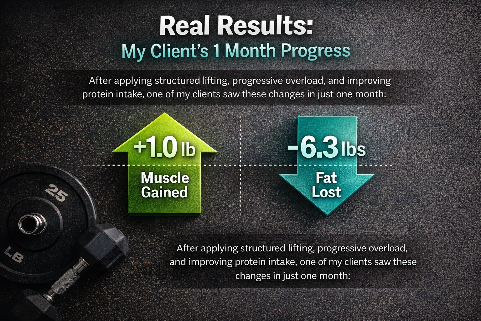 After applying structured lifting, progressive overload, and improving protein intake, one of my clients saw the following changes in just one month: